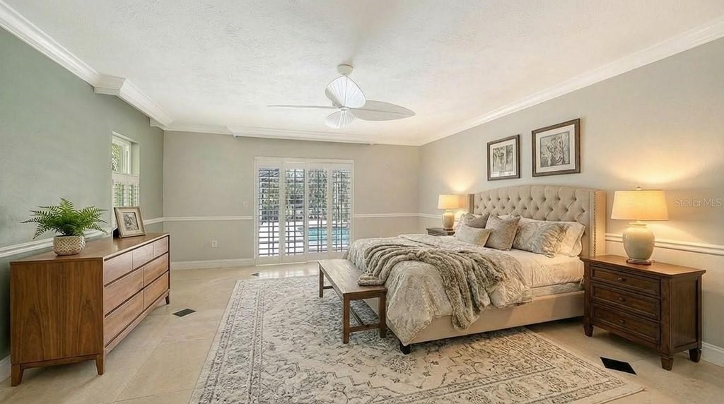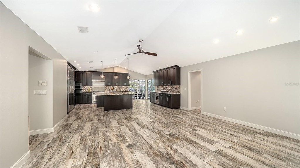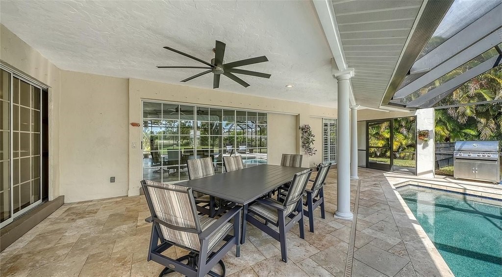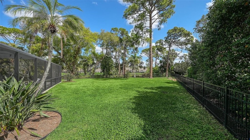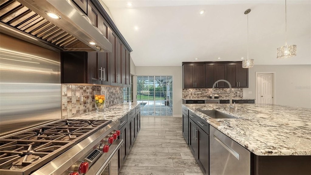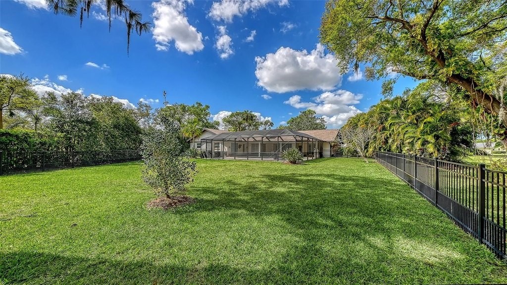 One or more photo(s) has been virtually staged. Rare opportunity in Broadmoor Pines at Palm Aire Country Club. This beautifully renovated home sits on over 3/4 of an acre at the end of a quiet cul-de-sac offering privacy, mature landscaping, and long water views with the 4th hole of the Lakes Course in the distance. Set deep off the road, this winding driveway and lush setting creates a striking arrival. New roof May 2025. Impact windows and a 3 car garage. The home is designed for comfortable everyday living and effortless entertaining, with porcelain plank tile flooring, crown molding, recessed lighting, upgraded ceiling fans and Hunter Douglas window treatments throughout. Gorgeous glass front doors open to formal living and dining spaces, while the open kitchen and family room form the heart of the home. The chef's kitchen features premium appliances: Wolf dual-fuel 6-burner gas/convection range, GE Monogram refrigerator/freezer, KitchenAid built-in microwave, Bosch dishwasher, and Uline two-zone wine cooler. Custom dovetail cabinetry with pull-outs, pull-out pantry storage, granite countertops, mosaic tile backsplash, and under-cabinet lighting provide both style and functionality. A large dining island anchors the space and opens to an expansive family room with vaulted ceilings and a stone gas fireplace. The split-bedroom floor plan provides excellent privacy. The primary suite includes travertine flooring, plantation shutters, sliding doors to the lanai, and two custom walk-in closets. The updated bath offers dual granite vanities and a large walk-in shower with frameless glass and multiple shower heads, including dual rain showers. A flexible den with pocket doors and a closet can serve as a fourth bedroom, with access to a nearby half bath. The guest wing, tucked behind a pocket door, includes two spacious bedrooms and a full bath with direct pool access. This outdoor living is exceptional with a re-surfaced (heated) saltwater pool, travertine pavers, expansive covered bronze screened lanai, and fully fenced backyard. Located just 15 minutes from downtown Sarasota, Lido Beach, and Sarasota-Bradenton International Airport. Palm Aire Country Club offers 36 holes of golf with optional membership, plus tennis, pickleball, fitness, pools, and an active social calendar.